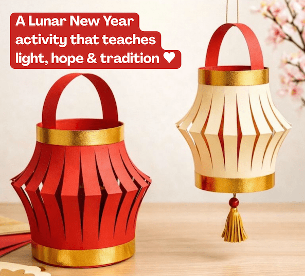 Paper lanterns are one of the most recognizable Lunar New Year crafts and are often seen during festivals and family celebrations. This simple activity helps kids explore fine motor skills while learning how lanterns symbolize light, hope, and guiding good fortune into the new year.