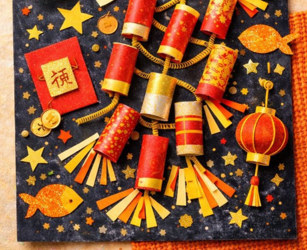 Firecrackers are an important symbol in Lunar New Year celebrations and are believed to drive away bad luck. This colorful collage activity helps kids express energy and movement while learning why bold colors and sounds are part of traditional celebrations.