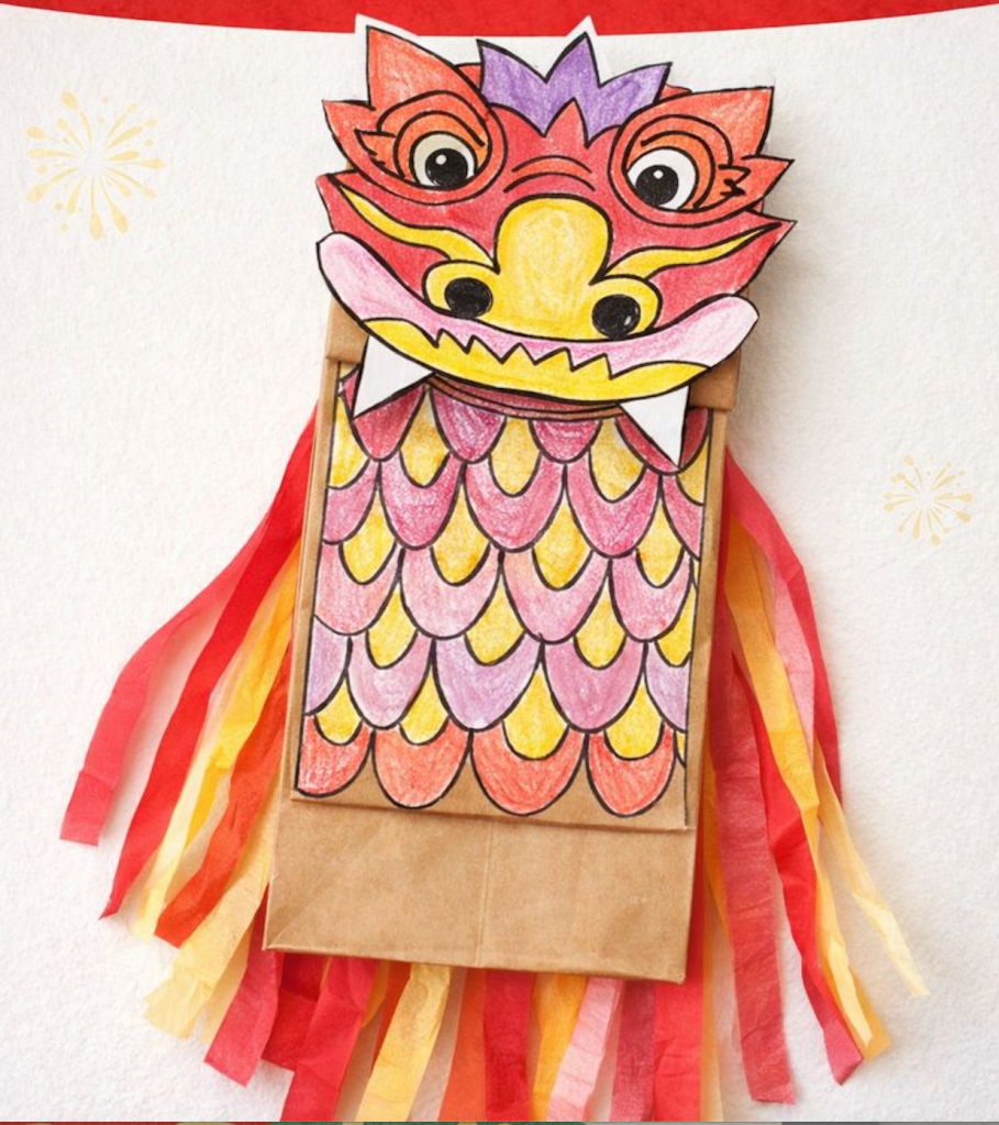 Dragons are powerful Lunar New Year symbols that represent strength, protection, and good fortune. Creating a dragon puppet encourages storytelling, movement, and imaginative play while helping kids understand why dragons are celebrated in parades and festivals.