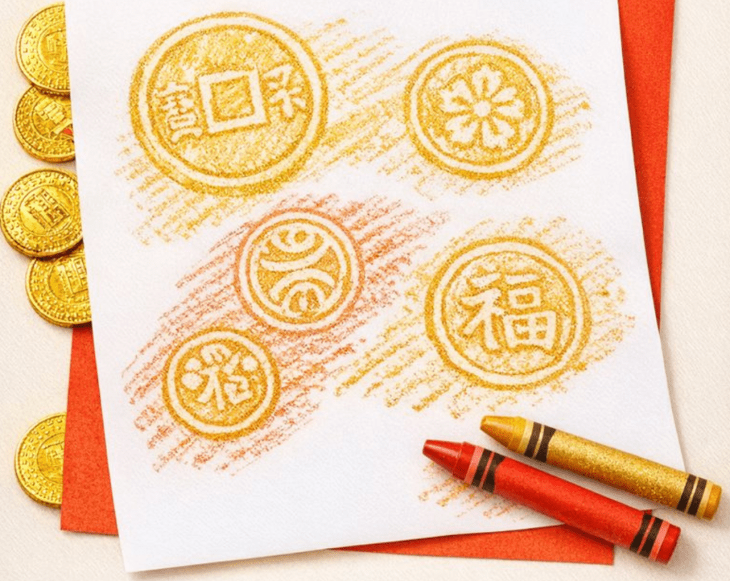 Gold coins symbolize prosperity and abundance during Lunar New Year celebrations. This tactile art activity helps kids explore texture while learning how symbols are used to express hopes for success and stability.