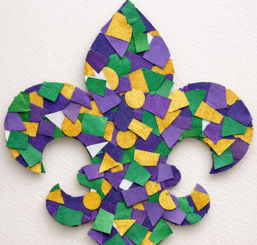 The fleur-de-lis is a traditional symbol often associated with Mardi Gras. This collage activity introduces children to symbolic shapes while encouraging discussion about how symbols are used to represent ideas, places, and celebrations.
