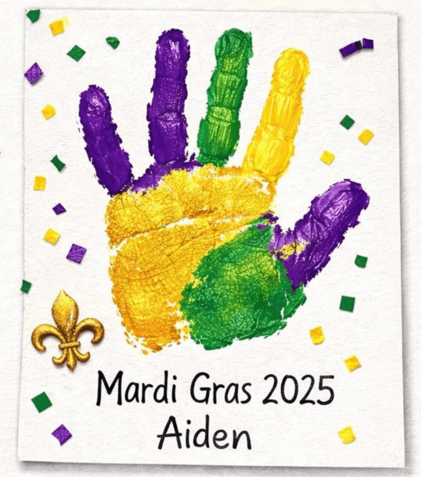 This colorful handprint craft creates a meaningful Mardi Gras keepsake for kids and families. It also supports fine motor development and provides a simple way to document learning and celebrations throughout the school year.