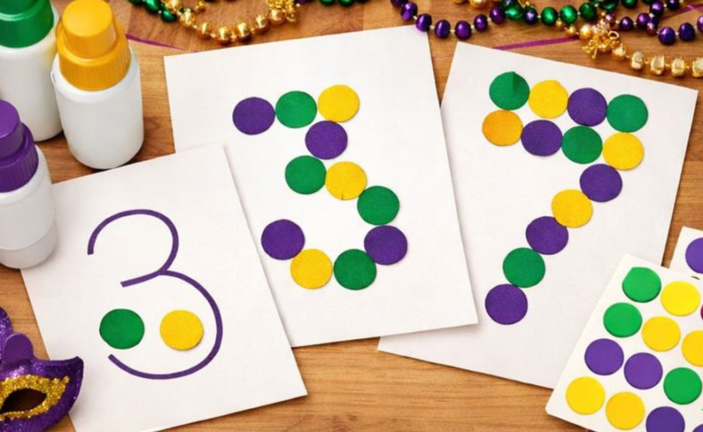 This dot art activity combines counting practice with creative expression using Mardi Gras colors. It’s an easy way to reinforce number recognition while building hand-eye coordination and focus.
