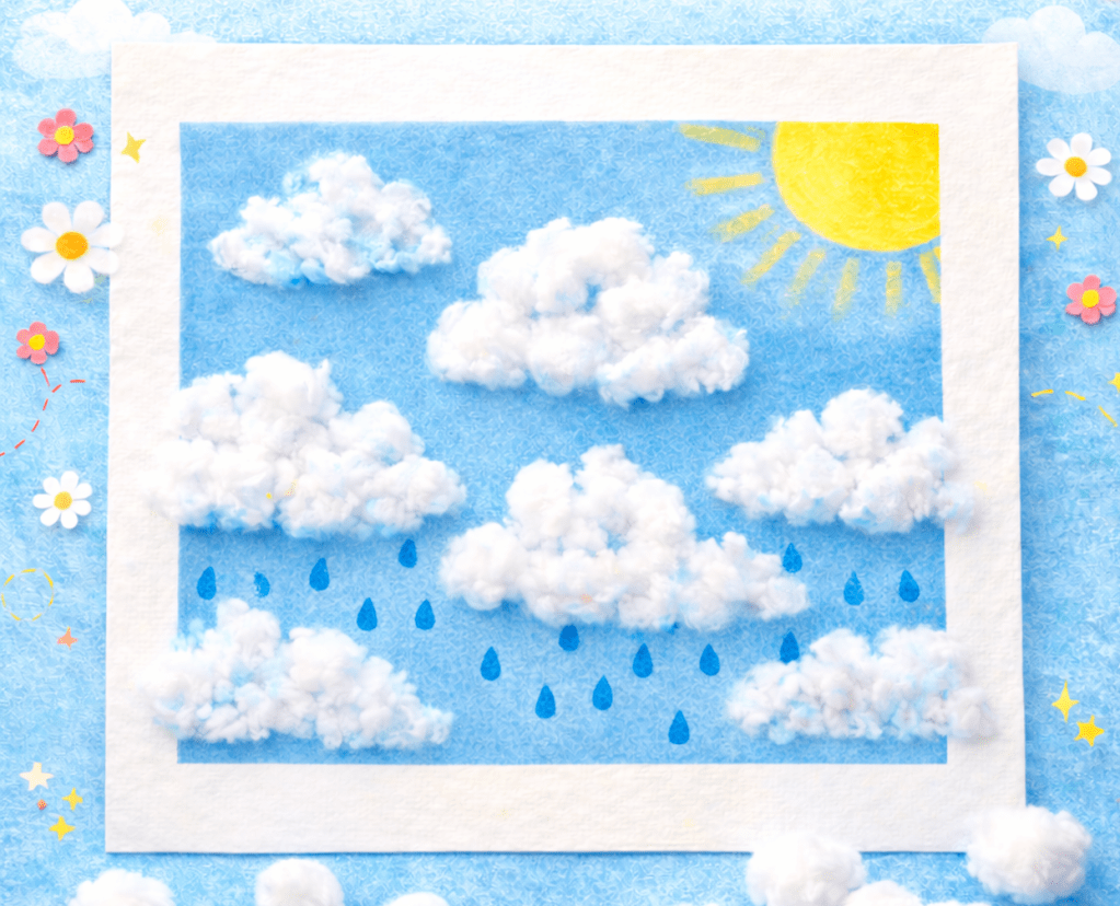 Soft cotton balls make the perfect fluffy clouds for a spring sky scene. Toddlers love the texture and simple pressing motion.