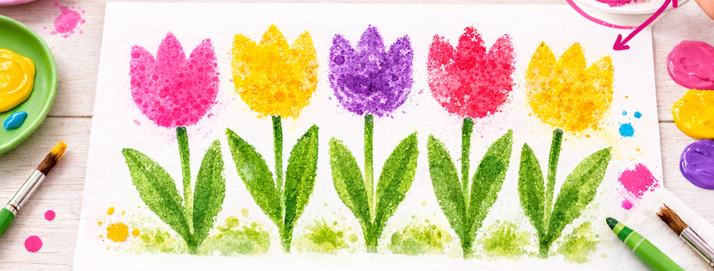 Stamping with a sponge makes painting easier and more controlled for toddlers. The result is a bright row of spring tulips.