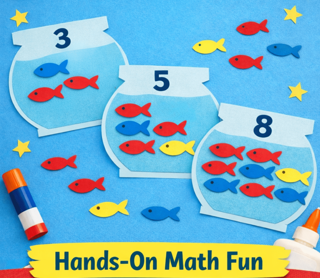 Inspired by One Fish Two Fish Red Fish Blue Fish. A colorful counting craft that builds early math skills through hands-on learning.