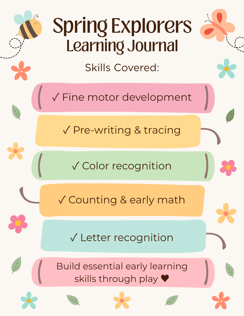 Looking for simple, screen-free ways to keep your little one learning and engaged this spring? Our Spring Learning Journal is filled with 50+ playful, hands-on activities designed for kids ages 2–5. From tracing and coloring to early math and matching, it’s an easy, no-prep way to build essential skills while having fun at home.